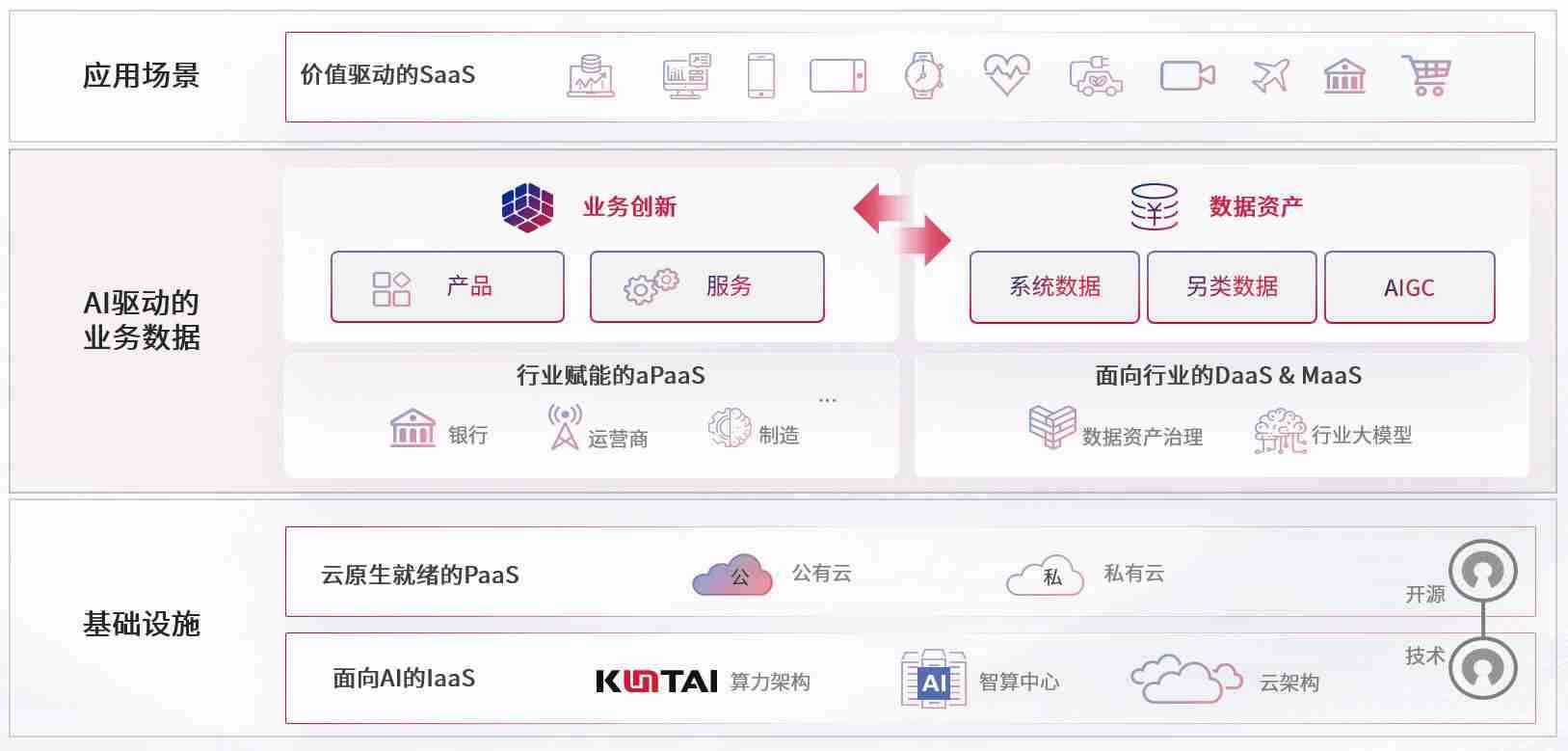 数字时代,,,围绕企业数字化转型的关键要素,,AG尊龙凯时数码开创性的提出数云融合战略和技术体系框架,,着力在云原生、、数字原生、、、、AI原生和信创产业上架构产品和服务能力,,为处在不同数字化转型阶段的快消零售、、汽车、、、、金融、、、、医疗、、、、政企、、教育、、、、运营商等行业客户提供泛在的敏捷IT能力和融合的数据驱动能力,,,,构建跨界融合创新的数字业务场景和新业务模式,,,助力企业级客户建立面向未来的核心能力和竞争优势,,,全面推动社会的数字化、、、智能化转型升级。。
